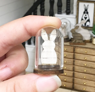Made of wood hand stained with a effect wash in white. Openable so you can either place your bunny in your scene or with the dome on!