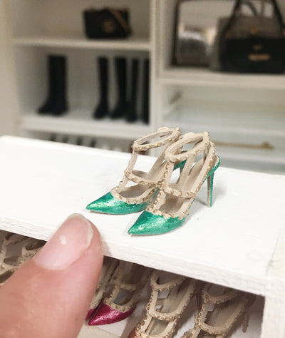 Miniature Dollhouse 1:12 Scale | Miniature Farmhouse Shoes Valentino Rockstar Pumps emerald iridescent