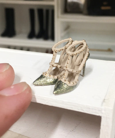 Miniature Dollhouse 1:12 Scale | Miniature Farmhouse Shoes Valentino Rockstar Pumps Olive iridescent