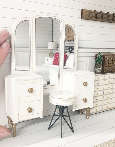 Miniature Dollhouse 1:12 Scale | Farmhouse Vanity Table Ivory & Stool