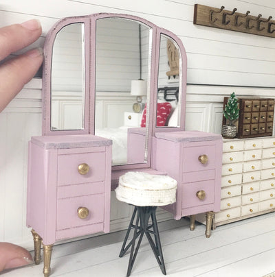 Miniature Dollhouse 1:12 Scale | Farmhouse Vanity Table & Stool | Rose Pink