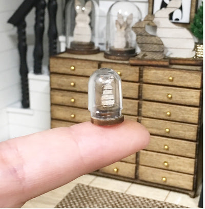 Made of wood hand stained with a effect wash in white. It is TINY! Openable so you can either place your bunny in your scene or with the dome on!