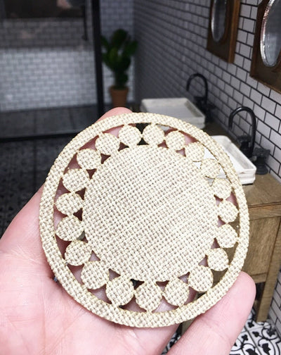 This Listing is for two mini jute rugs. They are 7cm across and would be suitable for use in a duo or a single rug. Made of a fabric with a jute weave. Plain on the back.
