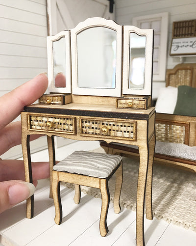 Miniature Dollhouse 1:12 Scale | Farmhouse Rattan Vanity & Stool
